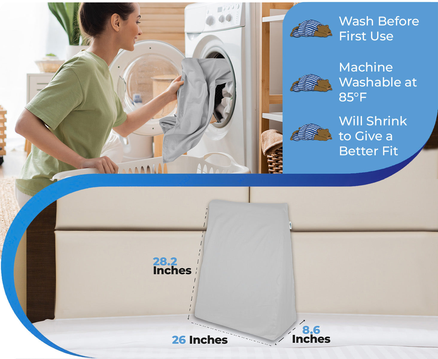 The pillowcase is intentionally made loose to avoid compressing the soft foam of the Sleepnitez 12" wedge pillow. Washing it once helps it shrink to the ideal size for a smooth, tailored fit. Before washing: 26.2" x 26.2" x 12.95" — After washing: 25.2" x 25.2" x 12.5".